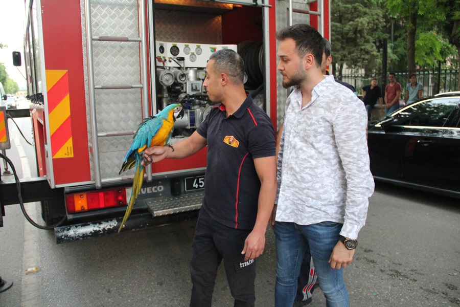 Manisa’da, ağaçta mahsur kalan bir papağan, Manisa Büyükşehir Belediyesi'ne bağlı itfaiye ekiplerinin uzun uğraşları sonucu kurtarıldı. Ağaçtan indirilen papağan sahibine teslim edildi.